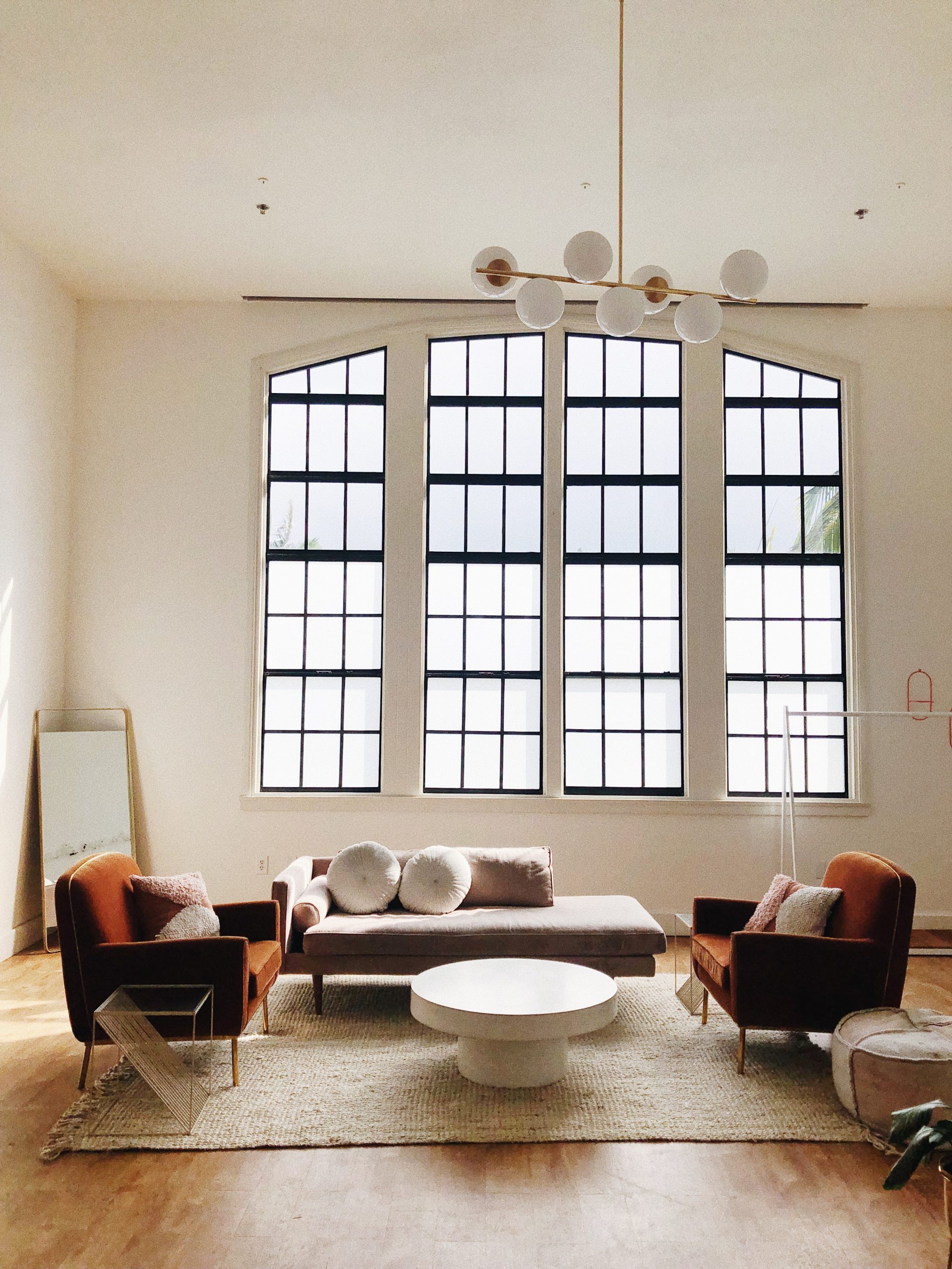 There is are two setting options of simple white background with industrial black-paned windows as well as a modern, creatively styled setting.